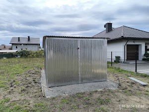 Billenő, a fronton balra eltolva, Hato kapumozgató automatikával (2 távirányító), vízszintesen barázdált T7 trapézlemezzel szerelt